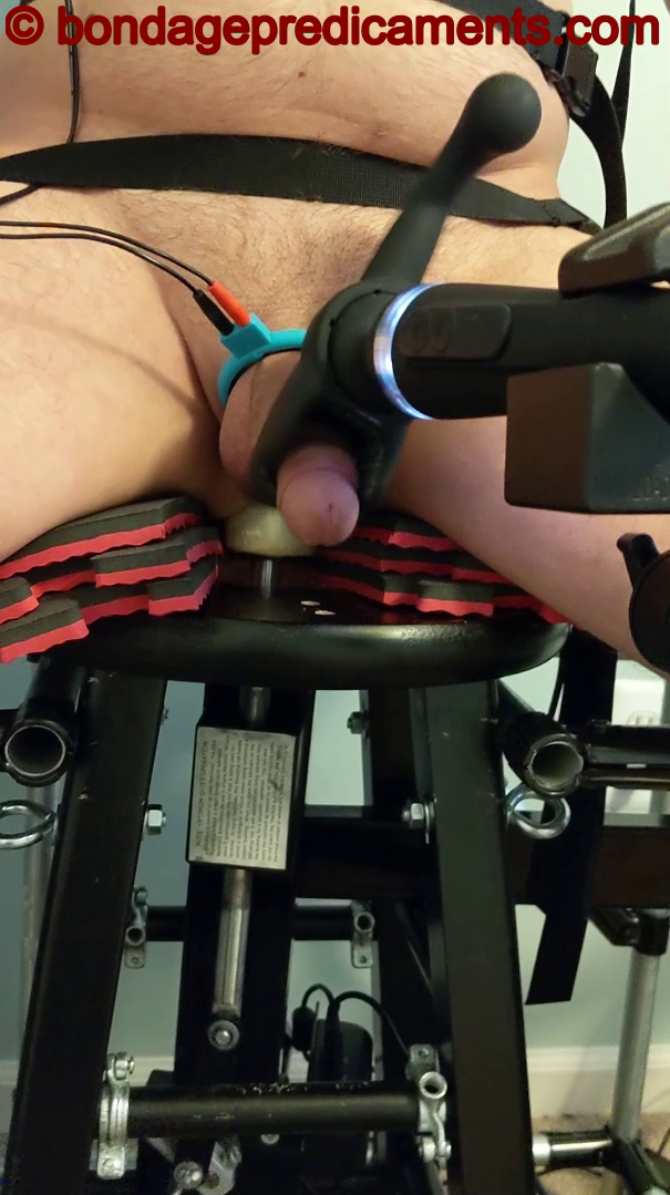 I've prepared a few extra "add-ons" to the Chairor of Terror, which are about to be used on him. First, I add an incredibly powerful, programmable vibrating wand, with an even more devious wand attachment. I clamp the wand into an adjustable arm that I've already attached to the Chaior of Terror, and move it into position so his cock is stuck within the studded inside of the wand attachment. Then, I turn the wand on, which immediately startles him and gets him moaning even more than before. "Oh fuck," he says, as the wand really starts getting to him...knowing there will be harsh penalties if he cums without my permission. But all he needs to do is get my permission before he cums, a very simple task, right? Well, maybe not...since the first step in getting my permission is asking for it. But how do you ask for permission to cum, when you're locked in a head harness with a built-in thick, muffling gag?