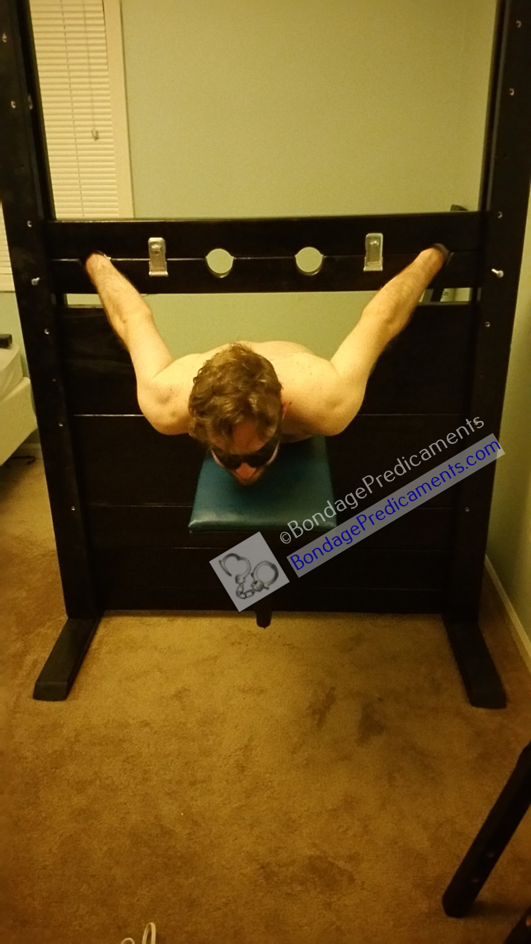 I was eager to try out a few new bondage positions I had come up with using the bondage wall and bench.  He looks pretty vulnerable, doesn’t he?