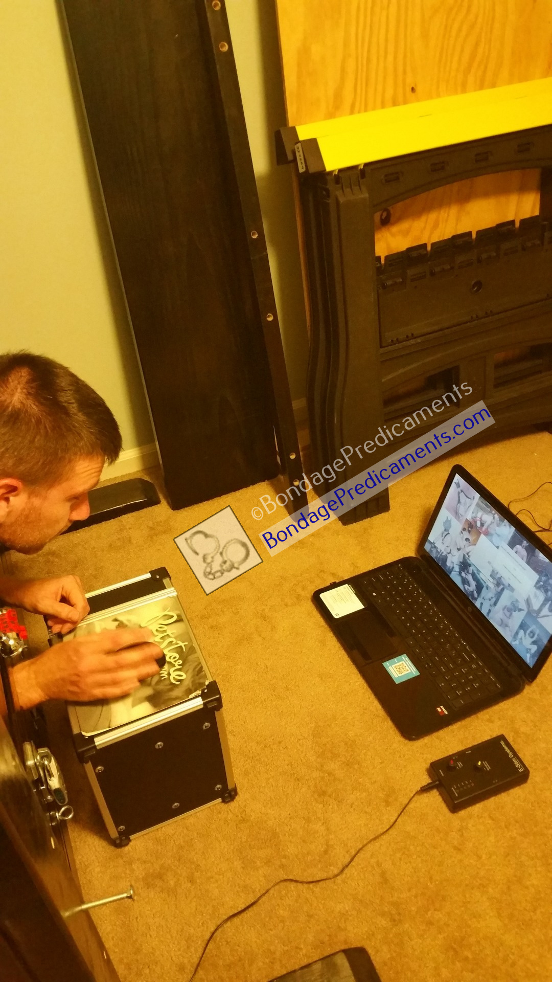 He also saw my ABox electro power box which he quickly figured out was wired to his cock behind the stocks. It’s a great power box which is sound activated, and reasonably priced too. It can be set to slightly sensitive, very sensitive, or anywhere in between with one of the dials, depending on how devious the Dom is feeling. He may not have realized it at the time, but I had placed it right next to the laptop speaker and put it on the most sensitive setting.