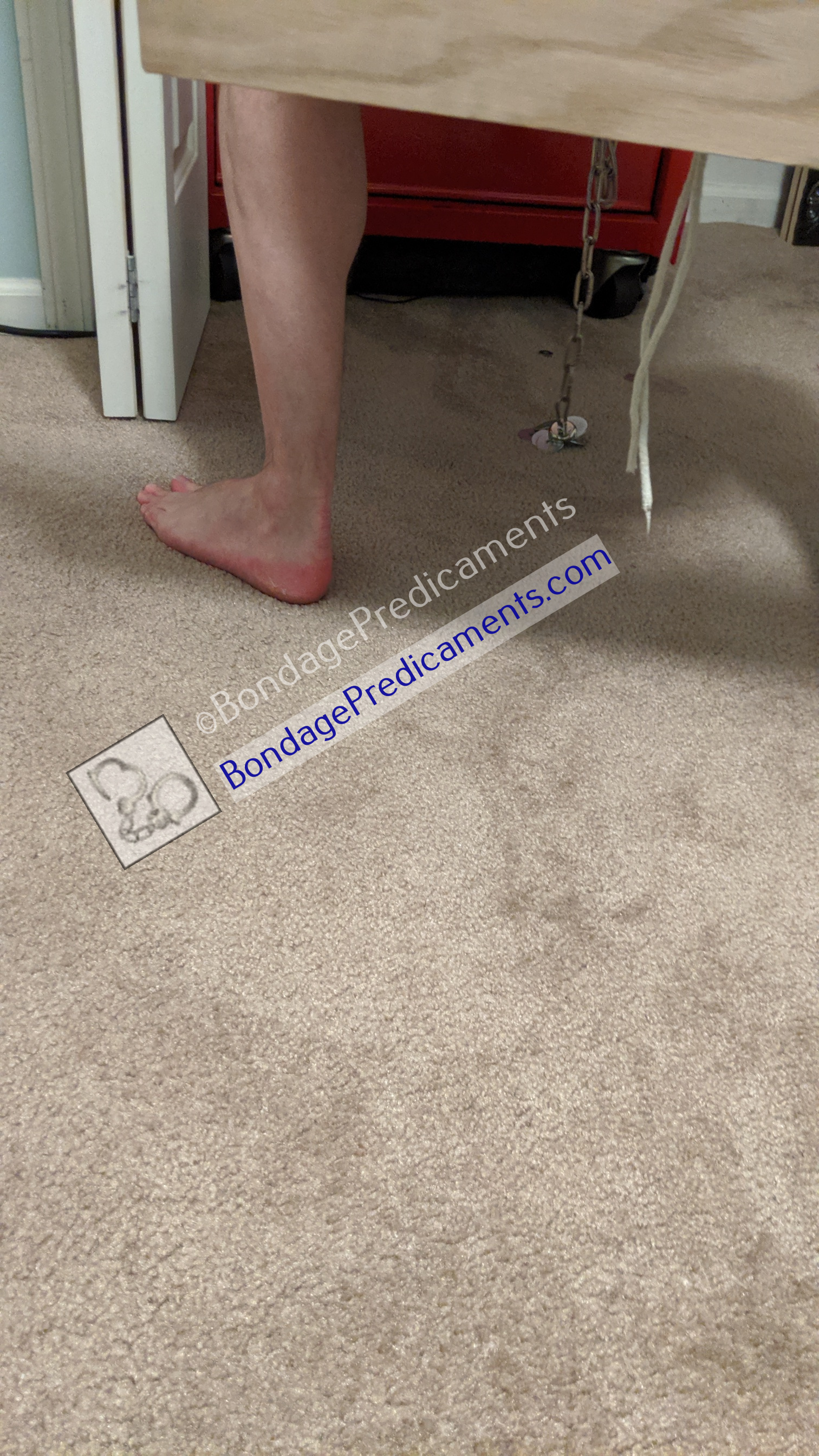 Thanks for the "reveal." I still think the soles of his feet are too exposed to ignore. Random whacks with a crop or belt when he's not moving fast enough. Or you could electro them. I'd like to see a pic of the rig without a sub attached.